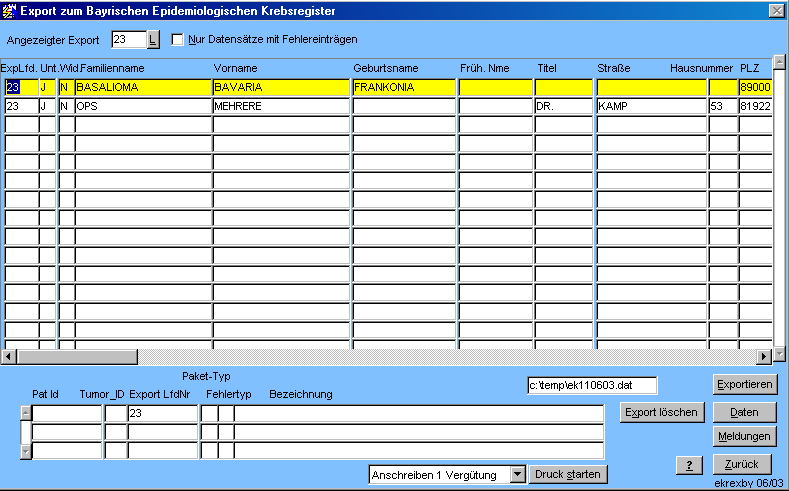 Im unteren Bereich werden Fehlereinträge angezeigt, d.h. Datensätze bei denen gewisse formale Voraussetzungen für eine ordnungsgemäße Konversion in das vom epidemiologischen Register geforderte Format nicht vorlagen.