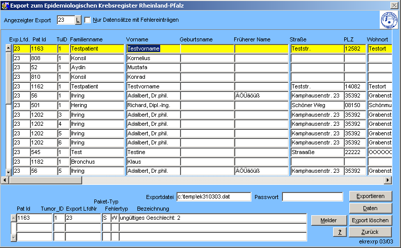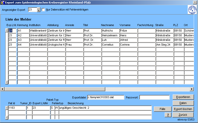 Im unteren Bereich werden Fehlereinträge angezeigt, d.h. Datensätze bei denen gewisse formale Voraussetzungen für eine ordnungsgemäße Konversion in das vom epidemiologischen Register geforderte Format nicht vorlagen.