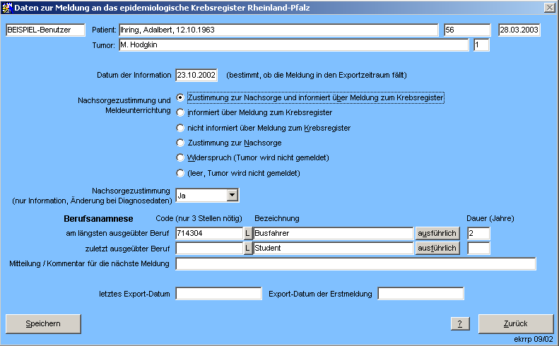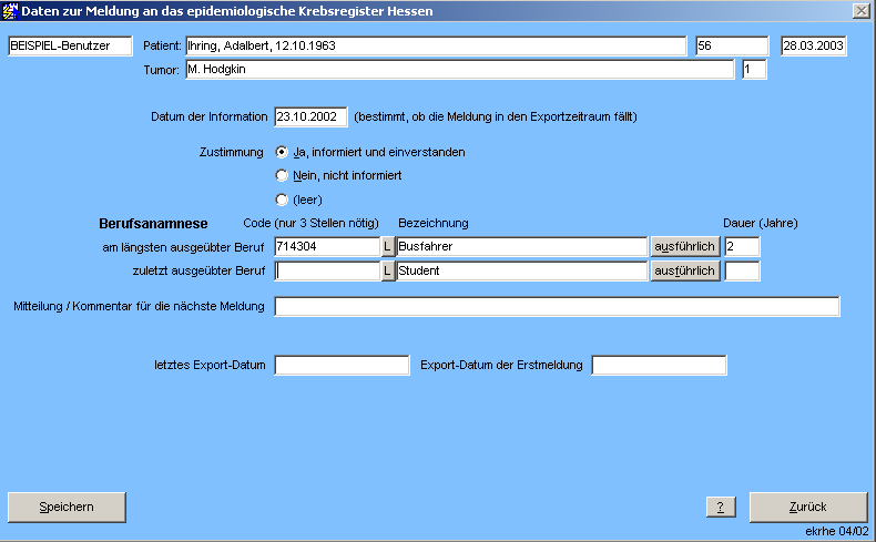 Allerdings sind selbstverständlich damit die spezifischen Daten (Berufsanamnese, Informationsstatus, ...) noch nicht gefüllt, so daß in der Regel (insbesondere hinsichtlich des Informationsstatus) ein Aufruf der Maske erfolgen muß.