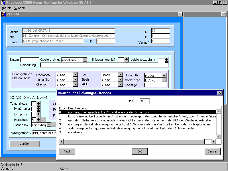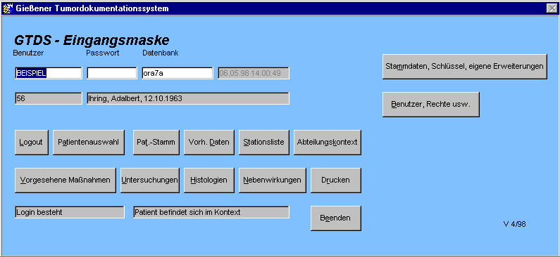 | Vorbemerkung: Diese Seite zeigt die zur Zeit realisierten Eingabemasken für die grafische Version des Gießener Tumordokumentationssystems aus der Sicht des normalen Benutzers. Die Systemverwaltungsfunktionen sind zum großen Teil bereits umgesetzt, stehen aber diesem Benutzer normalerweise nicht zur Verfügung. Die Bilder sind wegen der Größe der Bilddateien nicht direkt eingebunden. Bitte benutzen Sie die Funktion Back/Zurück Ihres Browsers, um aus den Bildern wieder in dieses Dokumenzt zu gelangen. Die Auflösung der Bilder auf dem Originalbildschirm wurde beibehalten, um eine möglichst gut erkennbare Version zu erhalten. Teilweise ist ein Benutzen der Scroll-Bars notwendig, um Bilder ganz zu sehen. GTDS und diese Bildschirmpräsentation werden kontinuierlich ausgebaut. | ![]() |