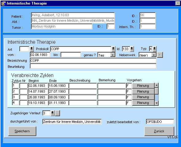 Nach jeder Therapiephase erfolgt eine Verlaufsdokumentation, wie in diesem Beispiel (Internistische Therapie mit zugehörigem Verlauf) dargestellt.